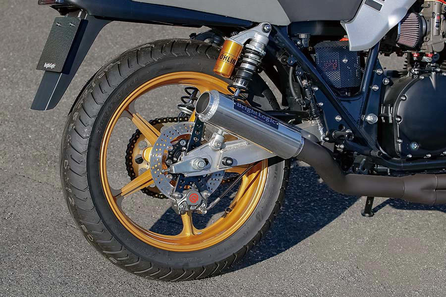 スイングアームはカタナ純正でショックはオーリンズ・レジェンド・ツイン(SU132)。前後ホイールはPMCソード・ヘリテイジでサイズは純正1.85-19/2.50-17に対して2.75-18/4.50-18。タイヤはブリヂストンBT46を履く。