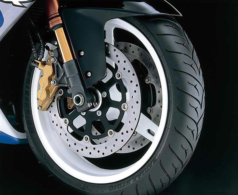 GSX-R1000独自の装備がフロントの6ポットキャリパー。倒立フォークはインナーチューブにコーティングが施される。
