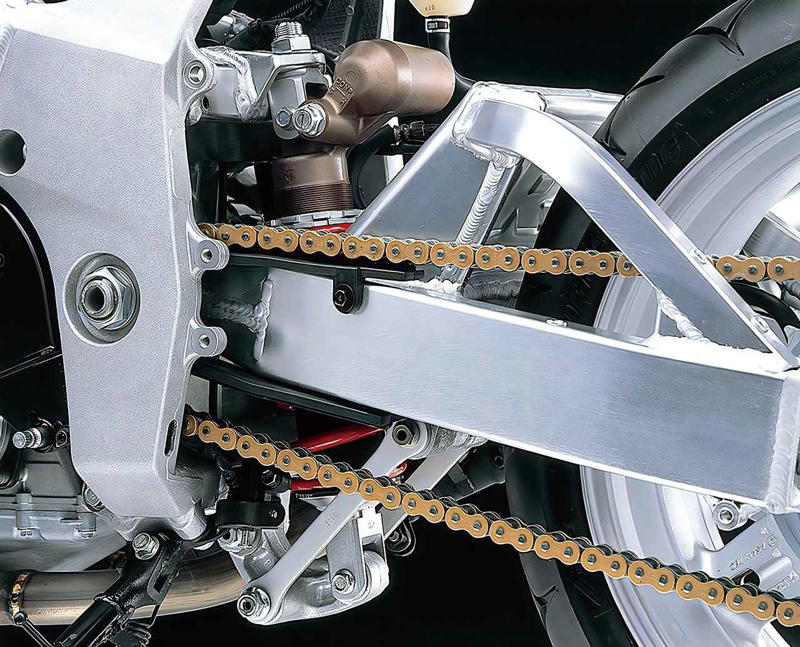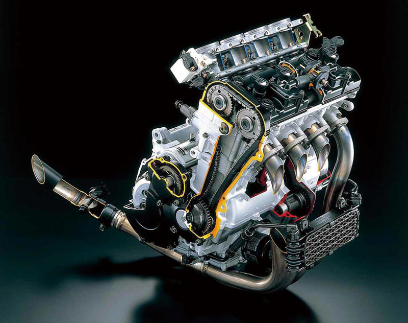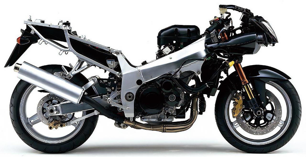 GSX-R750をベースにロングストローク化した排気量988ccエンジンは160PSを発揮。これを同じく750ベースのアルミツインスパーフレームに搭載、車重は乾燥で170kgという驚異の軽さを実現。750との重量差はたったの4kgだった。