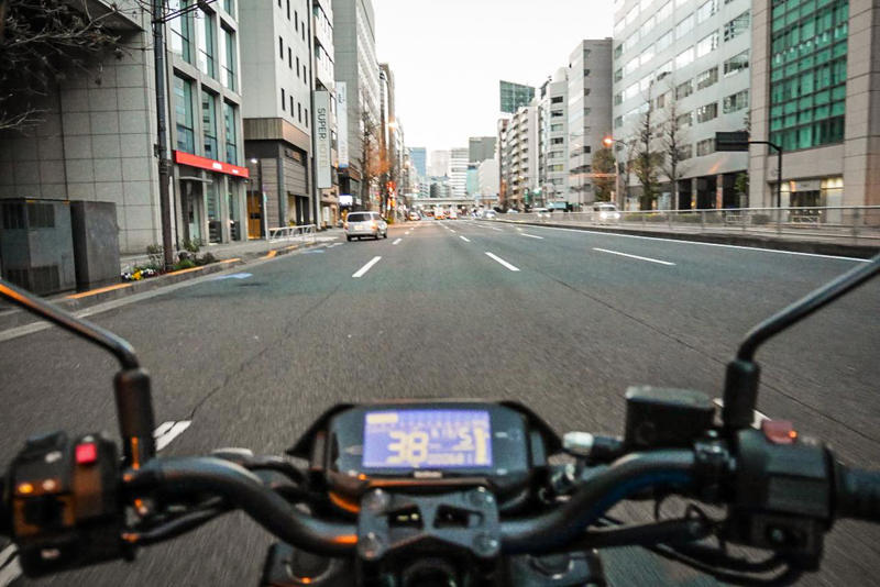 でも早朝の都心はガラガラでちょっと新鮮でした。リズムよく走ると幹線道路は青信号がつながって快走です。というかGSX-S125が楽しい。普通の街中なのに「アクセル開けて走ってる感」があるというか、予想していたよりストレスがありません。