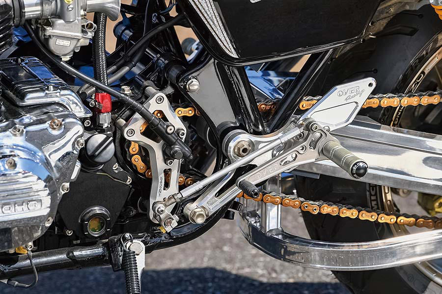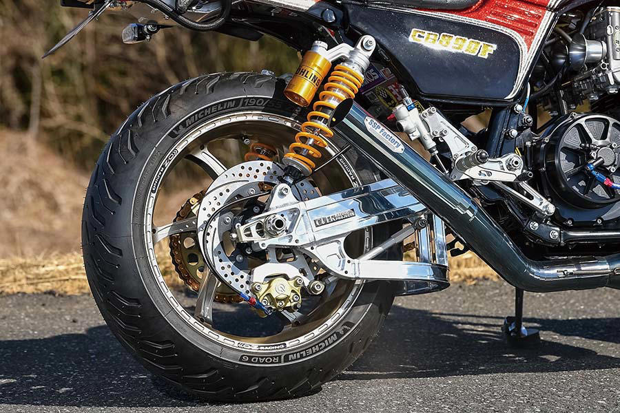 リヤサスはCB用のOVER RACING スイングアーム タイプ10にワイド仕様を特注してオーリンズ・グランド・ツインをマウントする。ホイールはO・Zレーシング・アルミ鍛造のGASS RS-Aで3.50-17/6.00-17サイズを履く。ドライブチェーンはEK530 MVXZ2を使う。
