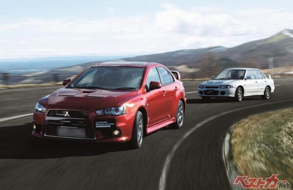 三菱自動車 ランサーエボリューション ファイナルエディション。ランエボシリーズの最終モデルとして2015年に登場。後方を走るのは初代ランエボだ