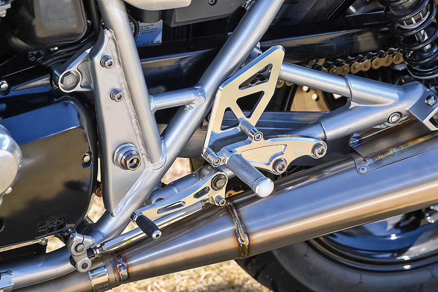 フロントフォークはΦ37mmの純正だがインナースプリングを変更して油面を調整、リヤにはオーリンズショックを組み合わせる。そして純正らしいルックスと構成、音のままで大幅な軽量化ができるオオノスピード・フルチタンマフラーを装着した。