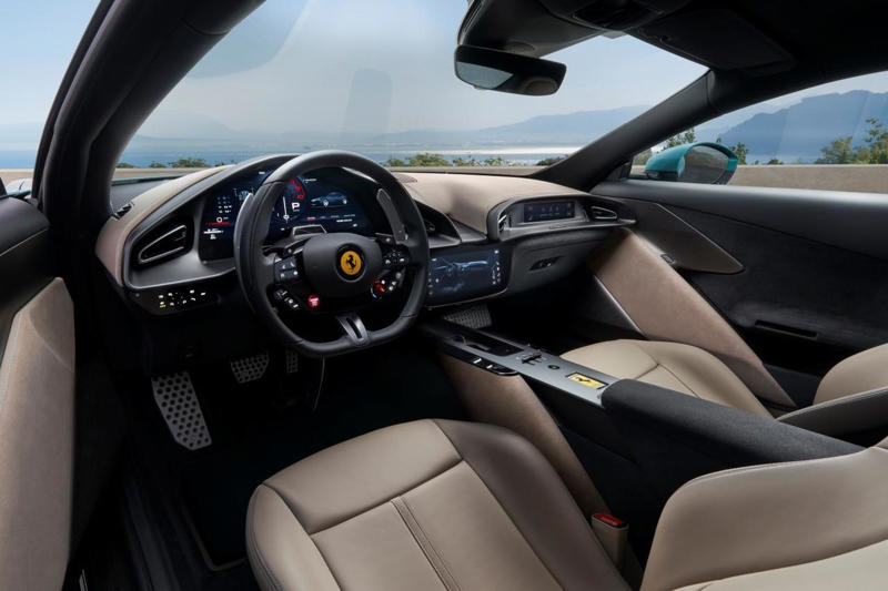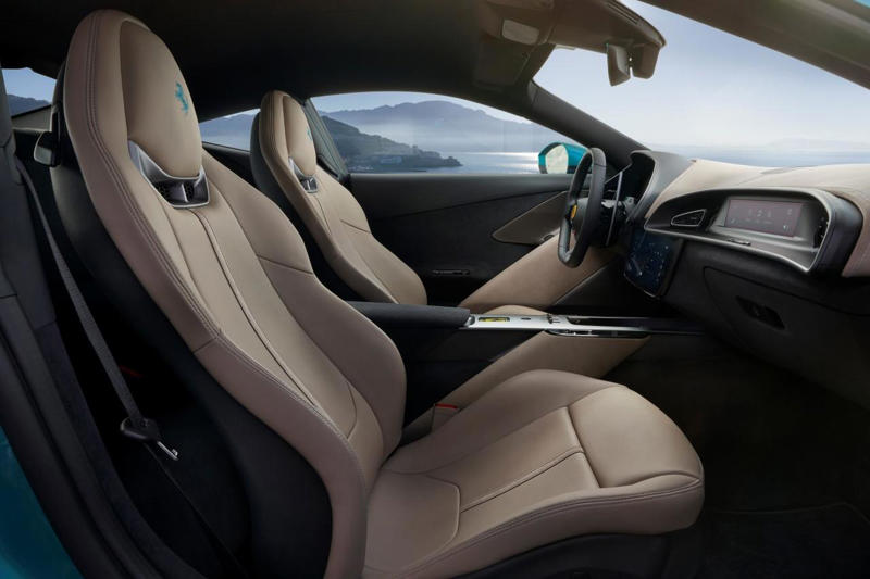 インテリアは「2+」構成、つまり前席2名+後席に小さなシートを持つグランツーリスモスタイルで設計され、スポーティなレイアウトの中にも上質な素材と最新インフォテインメントを融合。サウンドシステムや空調も高次元で調和し、フェラーリにふさわしいラグジュアリー性を備えている。