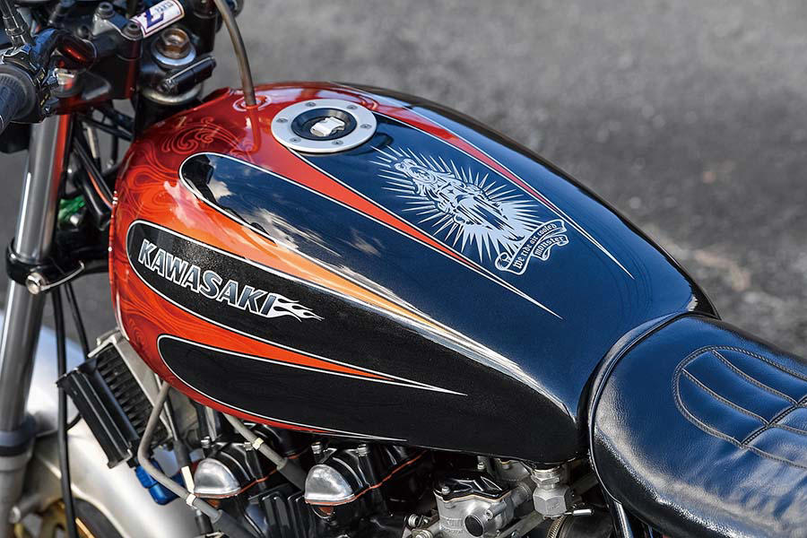 ロッズデザインでカスタムペイントされた外装は見ていくほどに深いテクニックが見て取れる。タンク前半のオレンジ部にはさらに別のパターンが入り、KAWASAKIロゴも最後のIにフレアが入るなど、つい見入ってしまう。