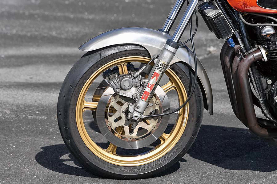 フロントフォークはモリワキカヤバΦ36mmで、ブレーキはAP・CP2696キャリパーをZAP製キャリパーサポートでリーディングマウントした。