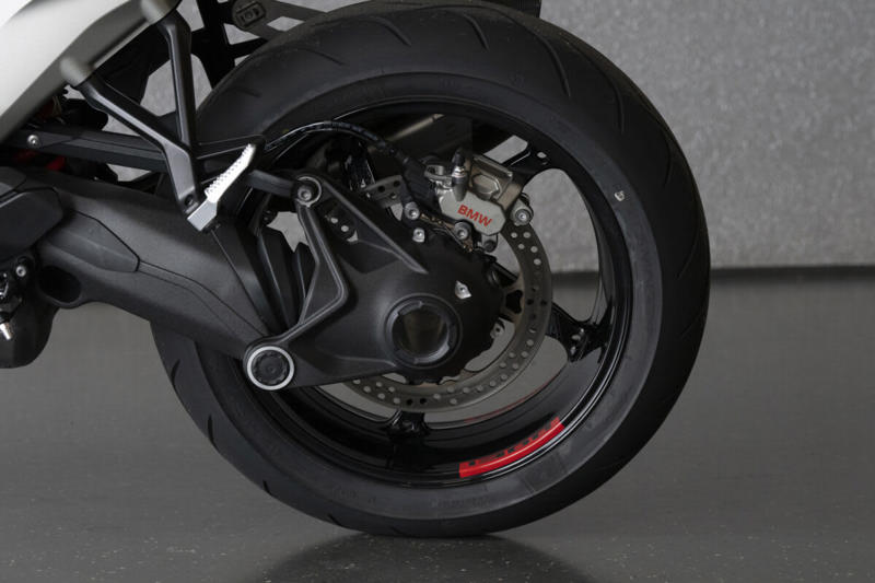 前後ホイールの写真はR 1300 RSのものですが、R 1300 Rも同様の仕様です。新採用のホイールはスポーティな5本スポーク。試乗車はリムに「1300」の文字入りデカールが貼られているのも印象的。最新世代のABS Proのフィーリングは土砂降りの状況でも安心してフルブレーキできました。
