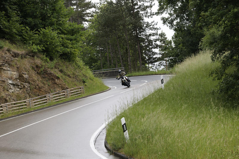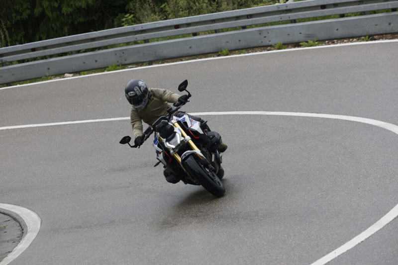 高速道路を小一時間ほど走ったあとは田舎道へ。おまちかねのワインディングロード!といいたいところでしたが、アウトバーンを降りたあたりから雨が激しくなってきました。やむなくレインモードに切り替えてワインディングへ。市街地の走行でもすでに感じていたのですが、ハンドリングは超がつくニュートラル。17インチのストリートファイター的ネイキッドだとどうしてもクイックなハンドリング特性を想像しますが、思った以上に乗りやすい。筆者は普段フロント19インチのR nineT Uraban G/Sに乗っています。じつはフロント17インチのネイキッドモデルがまあまあ苦手だったりするのですが、そんな苦手意識もどこへやら。近年のBMWの17インチロードモデルは本当に乗りやすい! 交差点やコーナーで思った以上に切れ込んだりすることもありません。