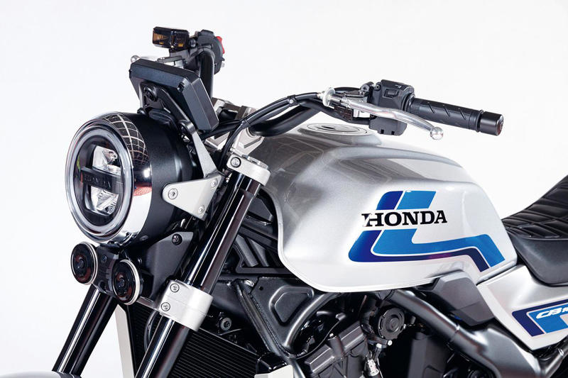 「スペンサーカラー」に身を包み、タンクからサイドカバー、テールカウルとつながる「ストリームライン」は往年のCB750Fをオマージュしながらも、CB1300SFなどにも通じる、ダイナミックで抑揚の効いたフォルムとしている。