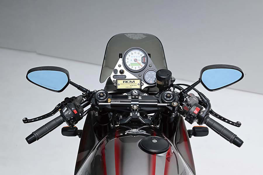 カタナ純正ではステアリングマウントだったメーターはこの車両ではカウル同様にフレームマウントされ、操作系の軽快感をプラスしている。フロントウインカーは純正位置に取り付けベースをアルミでワンオフして小型のものをマウント。スクリーンはオオノスピードの「匠」を装着。ミラーはマジカルレーシング・NK-1ミラーのタイプ2ヘッドだ。