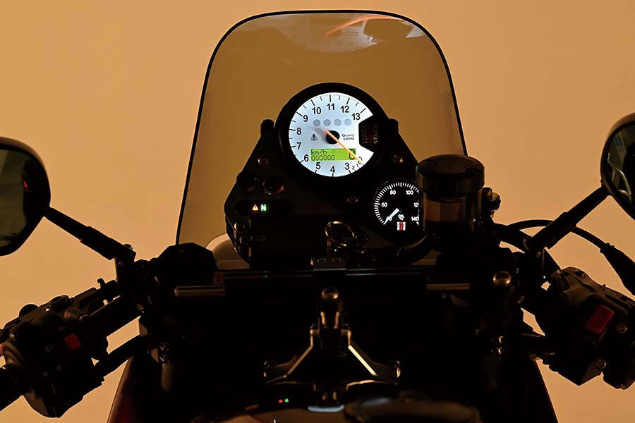 夜間走行時のコクピット部イメージ。速度や走行距離は回転計内のパネルに表示される。