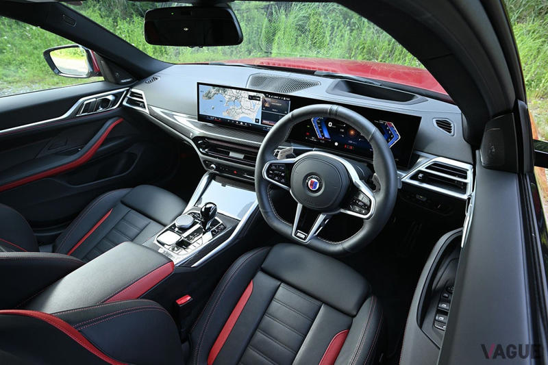 それでも、シフトまわりはアルピナの独自仕様で、従来モデルである「B4」と同じシフトノブ仕様となっています。試乗車はエクステリアに合わせ、ブラック/レッドのヴァーネスカレザー仕様となっていましたが、“オロ・テクニコ”のワンポイントやカーボンパネルとのマッチングが、渋めのコーディネイトのそれよりも好相性のように感じました。