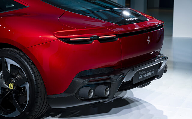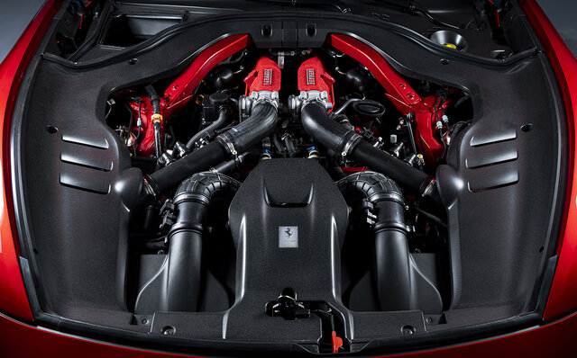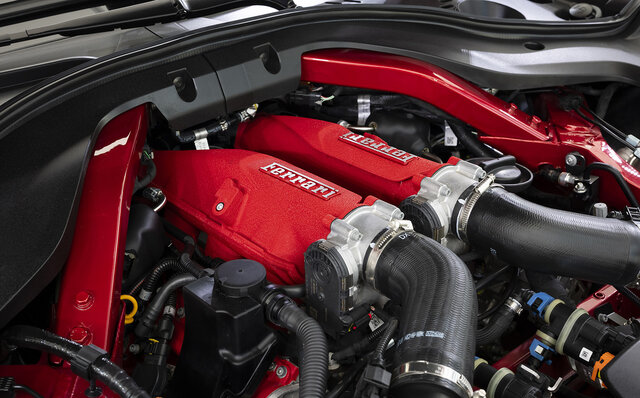長いボンネットの下には、「カリフォルニアT」に端を発するF154ファミリーから派生した進化型の3.9リッターV8ターボエンジンを搭載。ターボチャージャーの新キャブレーションにより「ローマ」より20psアップの最高出力640psを発生し、8段デュアルクラッチトランスミッションを組み合わせ、FRで走行する。