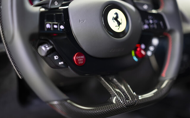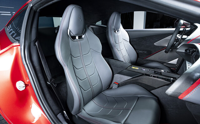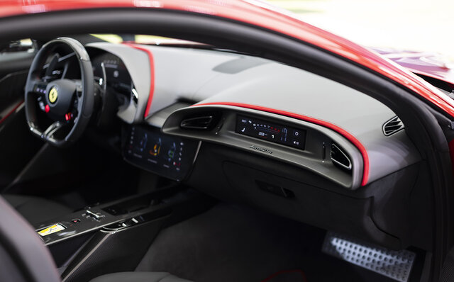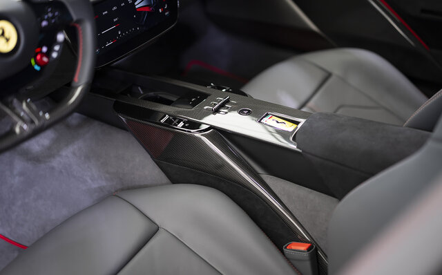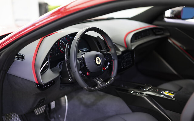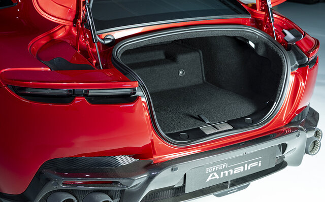 インテリアは、デュアルコックピットがローマから継承されたものの、デザインは大きく変更。ステアリングホイールには物理ボタンを装備し、アイコニックなスタートボタンも復活させた。後席には2+シートも設けられ、収納力がある点も大きなポイントだ。