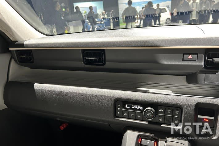 新型N-ONE e:の内装も外観同様、水平基調を強めた専用デザインのインパネが採用され、スマートフォンなどが置けるワイドなトレイが機能性を高めています。