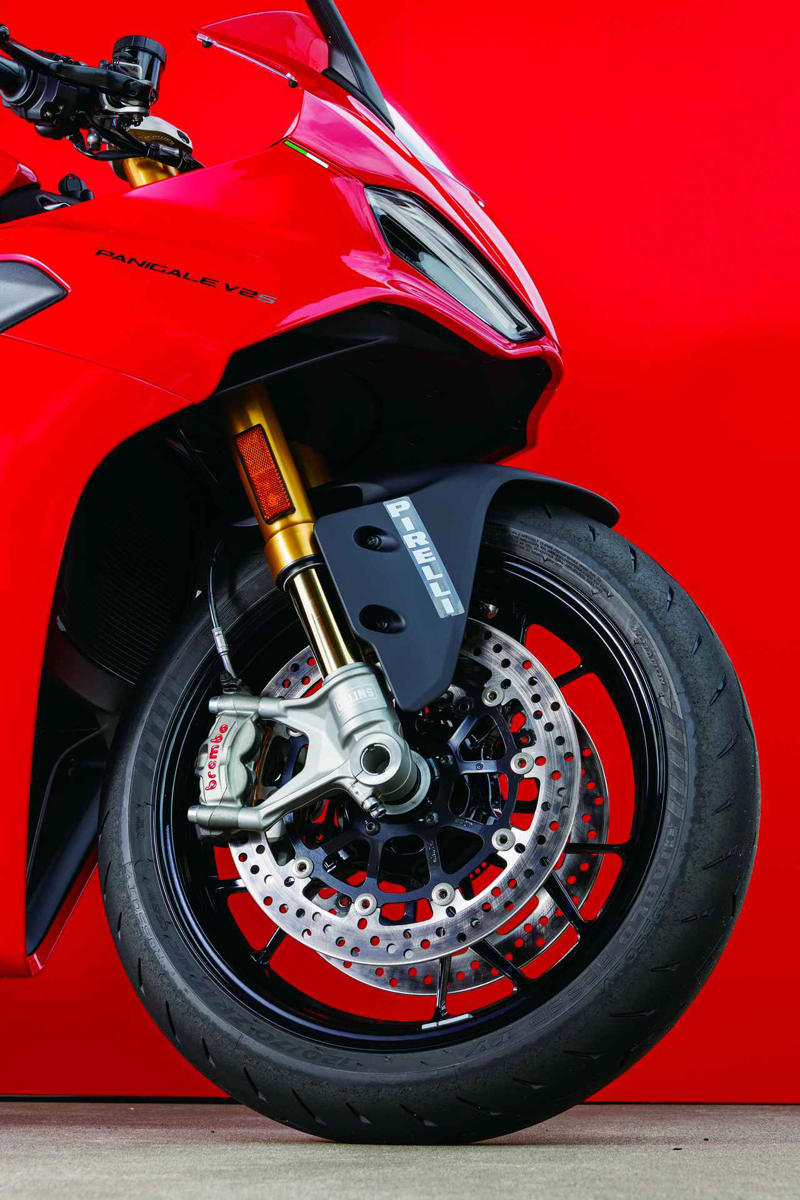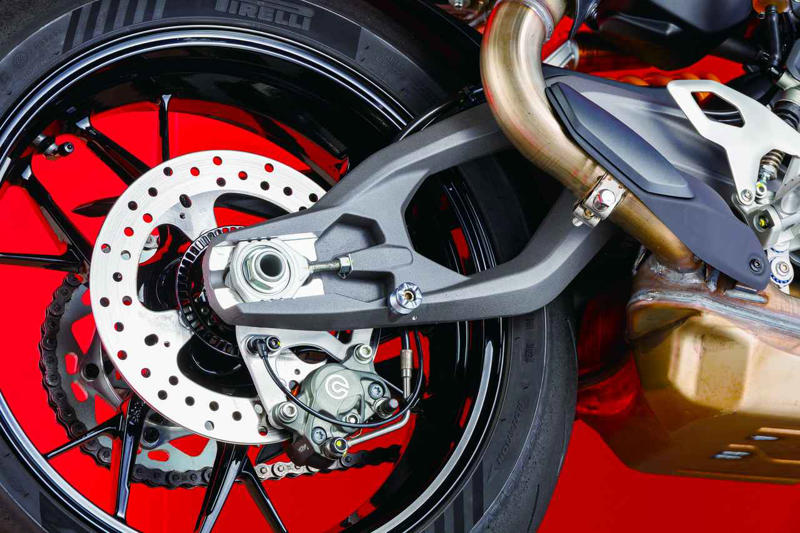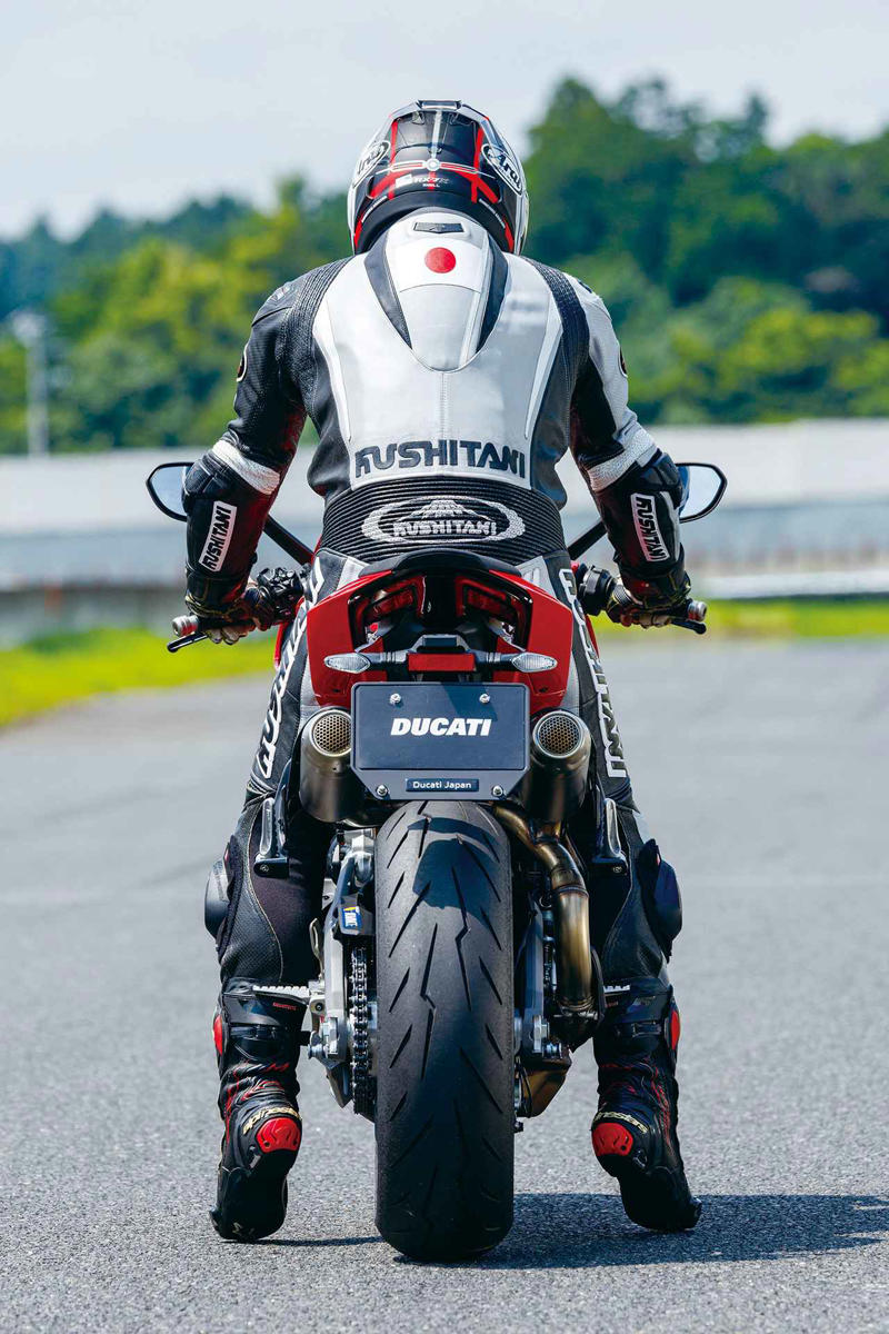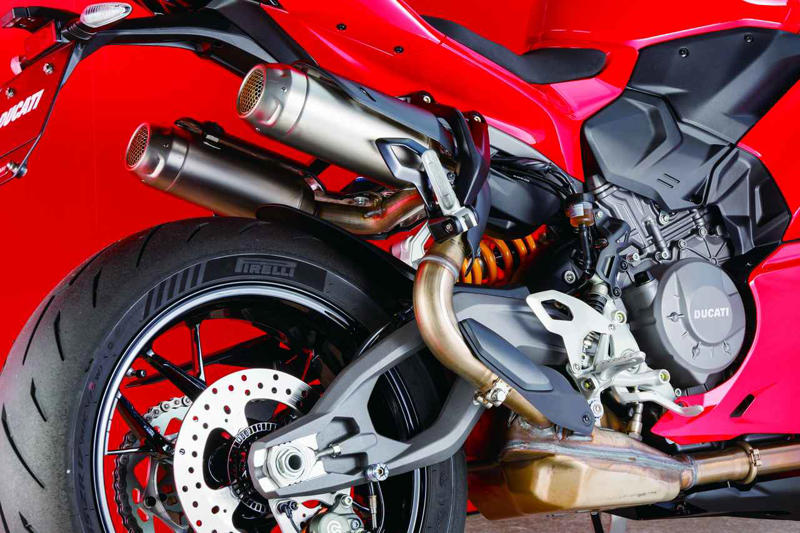 エンジンをシャシーとして活用し、エンジンからフレームやスイングアーム、サスペンションが生える車体構成。標準タイヤはピレリ製ディアブロロッソ4。サーキット派はハイグリップタイヤへの換装がお勧めだ。