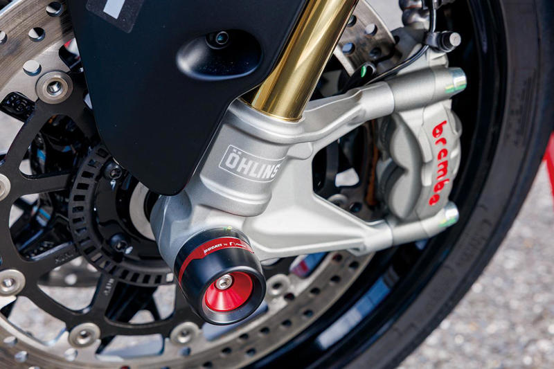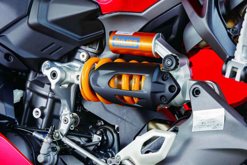 Sの前後サスペンションはオーリンズ製。スタンダードのフロントフォークはマルゾッキ製、リアサスはKYB製。キャリパーは共にブレンボ製M50。