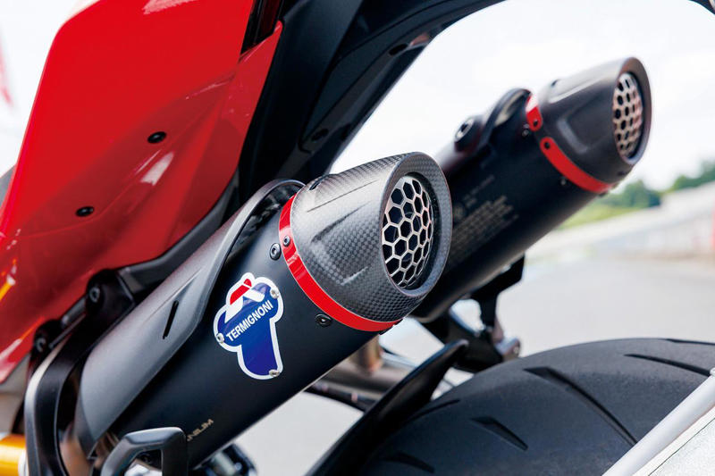 シート下に導かれる2本出しサイレンサーもパニガーレらしいデザインに貢献。サイレンサーがライダーに近い場所にあるため、ドゥカティ・Vツイン特有のエキゾーストノートも堪能しやすい。