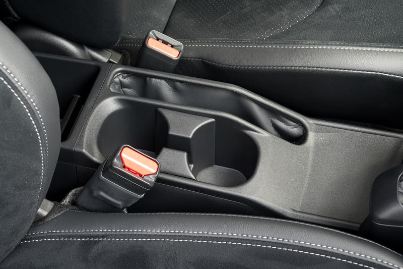 隙がないといえば、全グレードにオプション設定された縦引きのサイドブレーキもそうだ。ステアリングとシフトレバーの間に配することでリーチを縮めて反応速度とコントロール性を高めたそれは、今までメーカーのファクトリーオプションとして提供された事例に覚えがない。ここまできたら古い英国車のようにレバーはノッチレスのフライオフ式にして、利かせたサイドブレーキはボタンを押してロックするようにすればいいんじゃないかとも思ったが、さすがにそれはやりすぎだろうか。ただし、この安くはないオプション(13万2000円)はクローズドコースでお尻を滑らせるような走らせ方を優先したいという明確な目的意識をもって頼むべきものだと思う。取材車のようなATならともかくMTの場合、中・高速のサーキットをグリップで走るような用途では4~6速のトラベルに気を使うことになるかもしれない。
