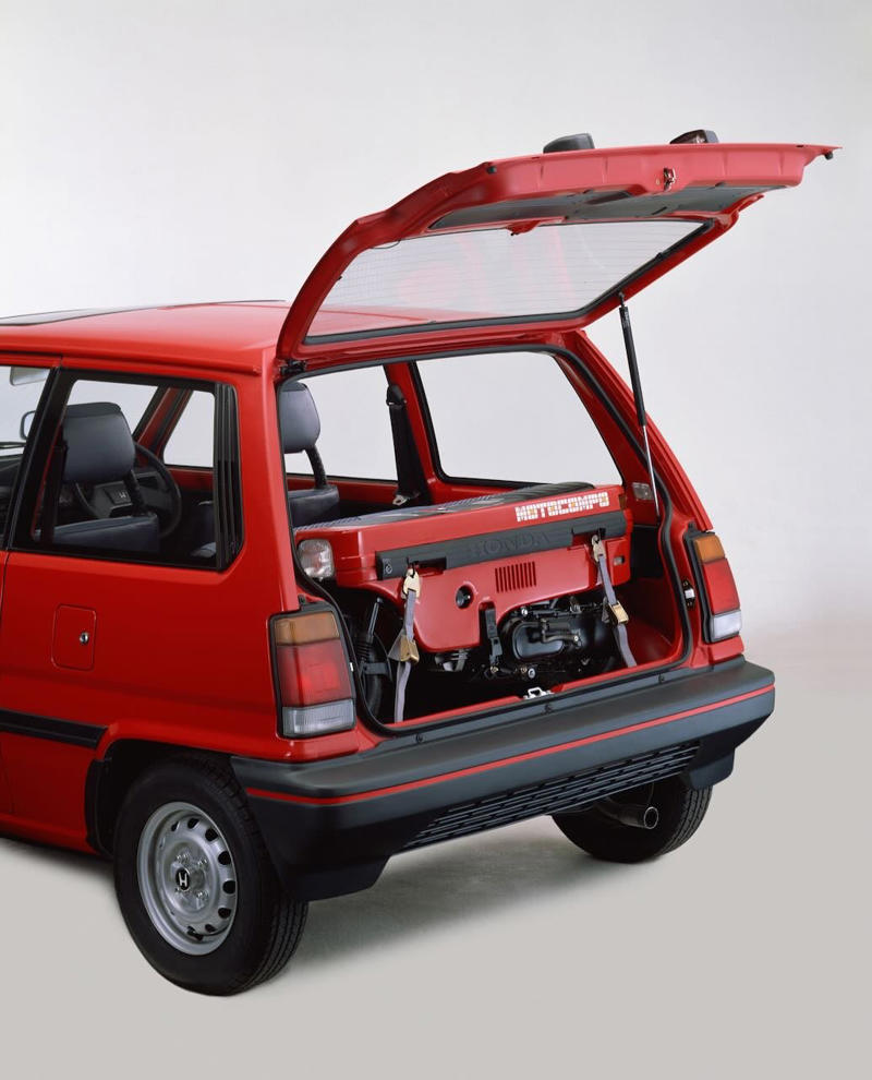 「シティ」にはトランクに収まる折りたたみ式50ccバイク「モトコンポ」のオプションが用意されていた(乗り心地は悪い)。
