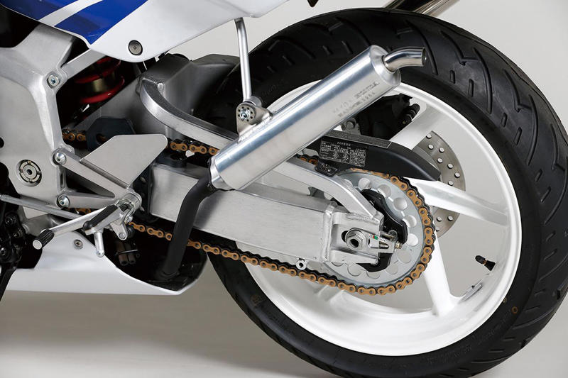 エンジン真下の排気チャンバーやテールパイプとの干渉が避けられ、排気系を内側に追い込んでバンク角を増大、空力特性を高めるなどの利点がある。チェーン調整部の構造はMC18と同じだが、鋳造の軸受け部は高さを増した。プレートがゴールドのドライブチェーンを継続する。左右ステップは先代同様にステップバーとペダルを同軸に固定するが、ヒールプレートが大きく変化している。
